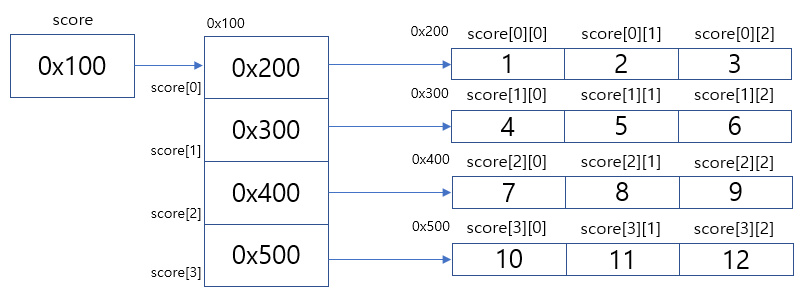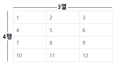 int[][] score = new int[4][3]; //4행 3열짜리 2차원 배열을 생성한다. 단 생성은 했으나 초기화는 하지 않은 상태.