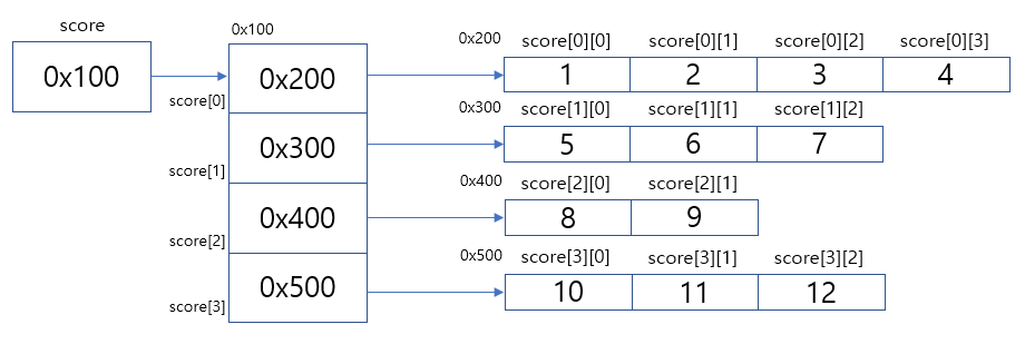 int[][] score = new int[4][]; //가변 배열 생성: 생선된 배열의 길이가 각각 다르다.