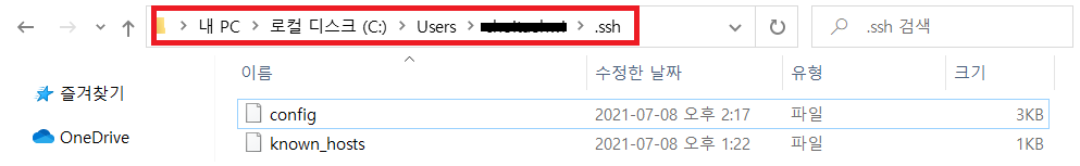 이때 config 파일은 확장자명을 지우고 C:\Users\Home\.ssh 안에 저장해주세요(아래 사진)