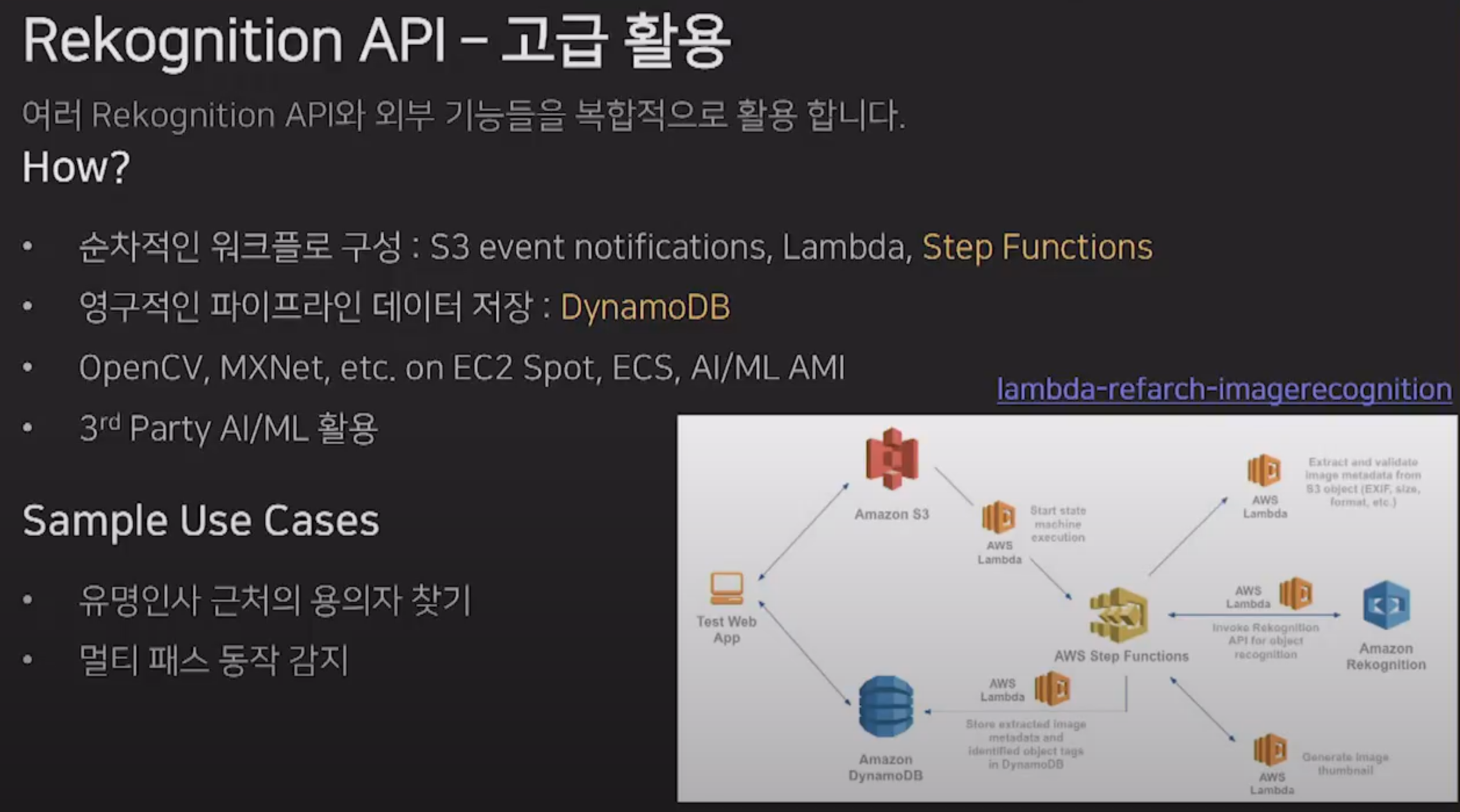 거의 대부분 Rekognition API 하나만으로는 기능을 만들기가 어렵기 때문에 여러 가지의 API와 Third Party AI API, Open Source 이미지 전처리 기술 등 다른 기술들을 함께 활용해야 한다. 이러한 부분을 순차적으로 진행하기 위해서는 Step Function을 이용해 어떠한 이미지 처리 프로세스를 순차적으로 일어날 수 있도록 할 수 있다.