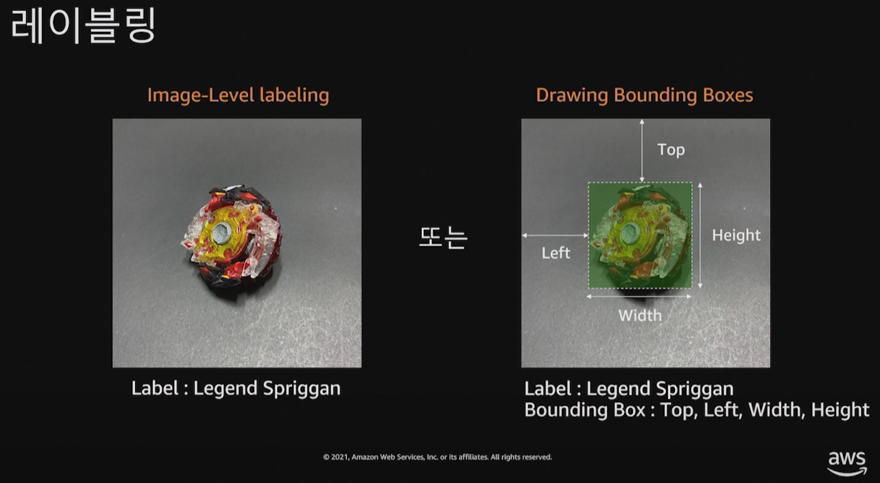 - Annotations 항목을 보면 레이블과 바운딩 박스 정보가 있는데 이는 반드시 S3에 이미지를 업로드하는 방식만 있는 것이 아니라 Local PC에 있는 이미지를 Custom Labels에 직접 업로드해서 레이블링을 할 수도 있고, Amazon SageMaker Ground Truth에서 미리 만든 레이블링 결과를 가져와서 학습 데이터로 활용할 수 있습니다.