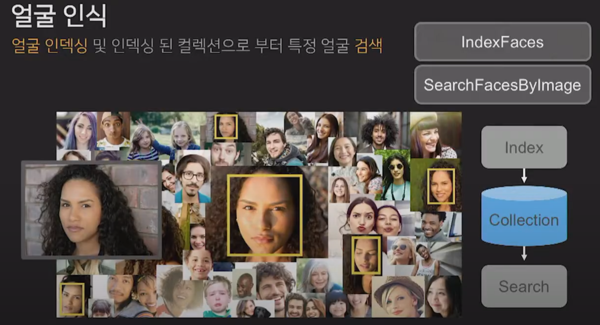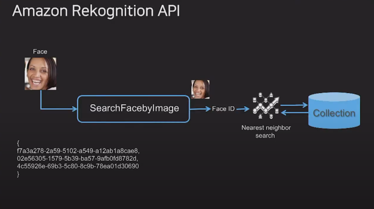 얼굴을 가지고 일종의 저장소(Collection)를 만든 뒤 만들어진 저장소 내에서 새로운 사진을 가지고 와서 해당 얼굴과 매칭이 되는 사람이 존재하는지 검색해 주는 API.