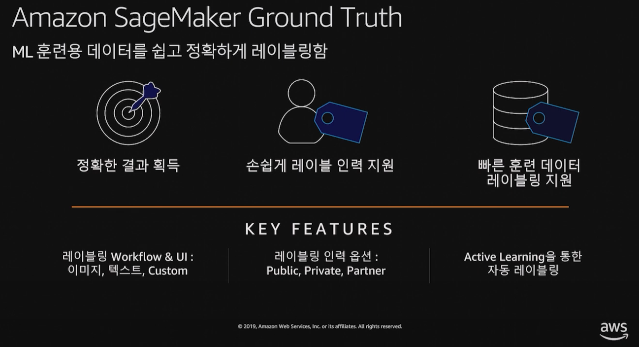 - Amazon SageMaker의 Ground Truth : 중요한 레이블링 작업을 빠르고 정확하게 할 수 있도록 제공하는 서비스