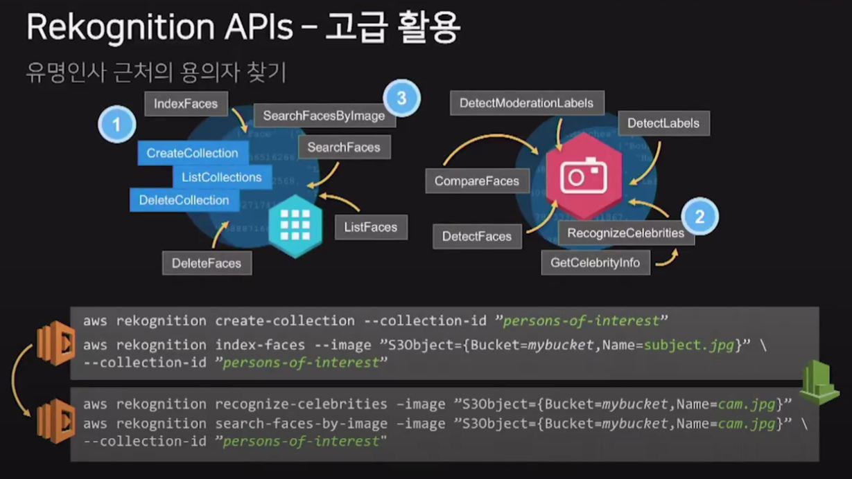 첫 줄을 보면 create-collection이 있는데 이 중 persons-of-interest라는 용의자 컬렉션을 하나 만든 뒤, 다량의 용의자 데이터들을 index-faces라는 커맨드를 입력하여 용의자라는 컬렉션에 계속하여 학습을 시킨다.
