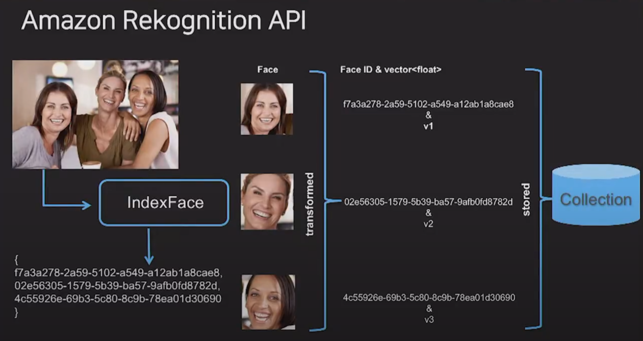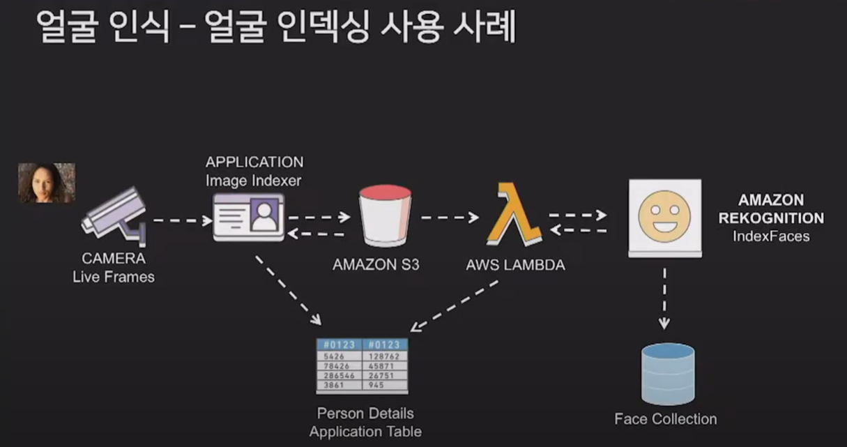 보관한 이미지를 컬렉션에(face collection) 넣어주는 형태로 컬렉션에 들어간 뒤 face_id를 리턴 받아 람다가 돌려받은 뒤 S3에 저장된 이미지와 이미지의 URL을 매핑시키기 위해 해당 데이터를 DynamoDB와 같은 애플리케이션 테이블에 저장하게 됩니다.