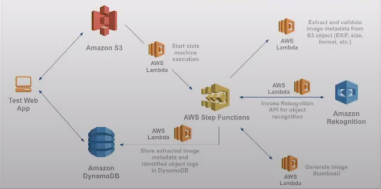 람다 step function 호출 - 기본적 이미지 전처리 - rekognition 호출 - 썸네일 생성 - 데이터베이스에 저장